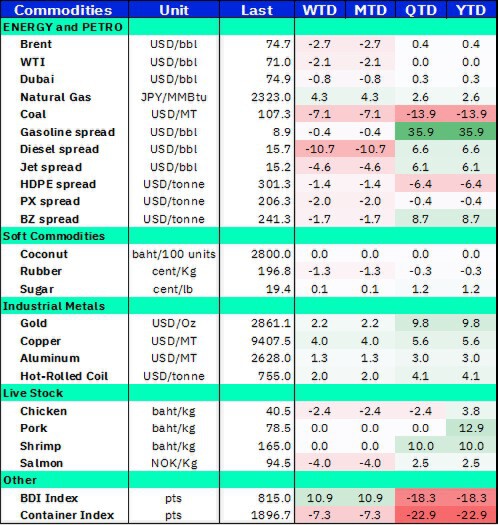 สัปดาห์ที่ผ่านมาราคาน้ำมันดิบปรับตัวลดลงเฉลี่ย -2.4% จากทั้งความกังวลสงครามการค้า, แนวทางการเพิ่มกำลังการผลิตน้ำมันของสหรัฐฯ ผสานกับตัวเลขสต๊อกน้ำมันดิบรายสัปดาห์ที่เพิ่มขึ้นเกินคาด ขณะที่ราคาค่าการกลั่นมีการฟื้นตัว และ Crude Premium ปรับเพิ่มขึ้น หลังจากจีนและอินเดีย เริ่มหันมาซื้อน้ำมันจากตะวันออกกลางมากขึ้น แทนการสั่งซื้อจากรัสเซีย ที่โดน sanction สำหรับส่วนต่างปิโตรเคมียังคงปรับลดลงต่อเนื่อง โดยสำหรับสัปดาห์นี้อาจเก็งกำไรหุ้นที่อิงบวกจากราคาน้ำมันดิบย่อตัว (Anti-oil) เช่น กลุ่มยางมะตอย (TASCO) เป็นต้น