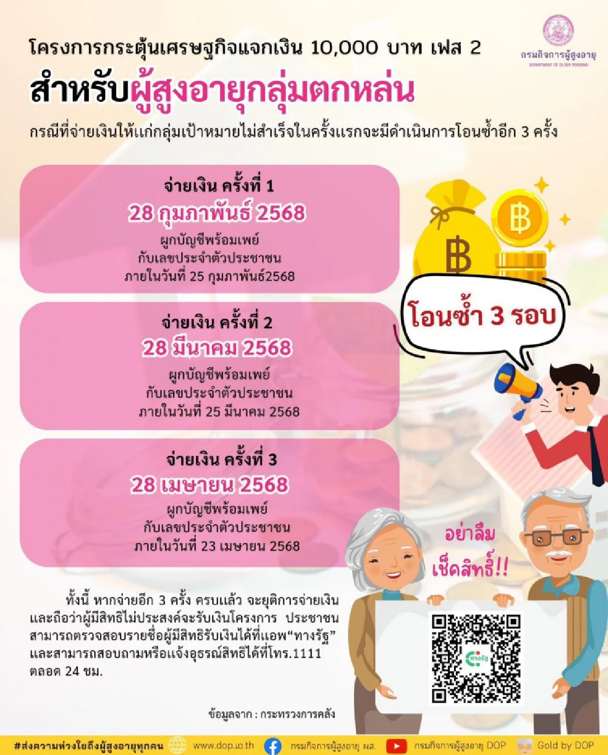 ทั้งนี้ หากจ่ายอีก 3 ครั้ง ครบแล้ว จะยุติการจ่ายเงินและถือว่าผู้มีสิทธิไม่ประสงค์จะรับเงินโครงการฯ