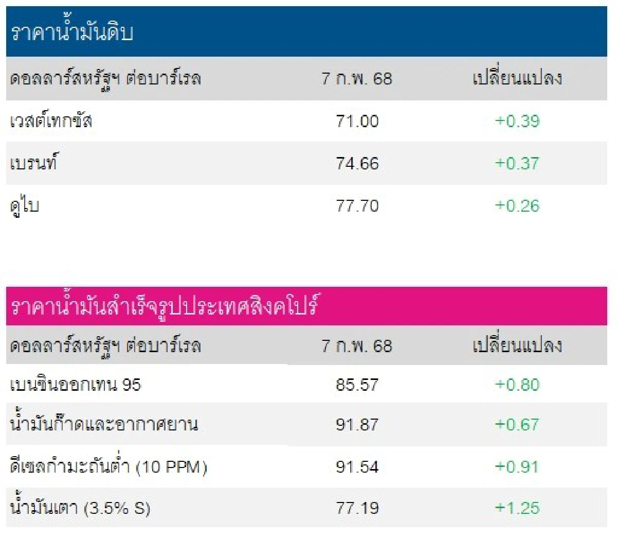 เวสต์เทกซัส 71.00 ดอลลาร์สหรัฐฯ /บาร์เรล เบรนท์ 74.66 ดอลลาร์สหรัฐฯ /บาร์เรล