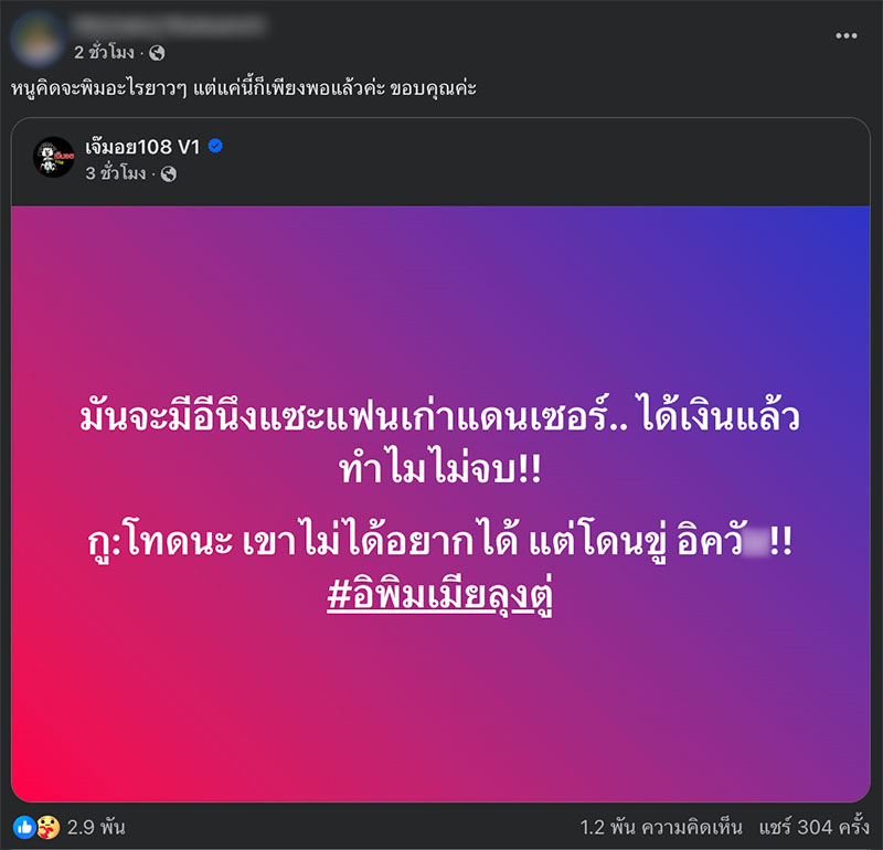 อดีตแฟนสาว ‘บอส แดนเซอร์ลำไย’ โพสต์แซ่บ! แชร์โพสต์เพจดังแทนคำตอบ