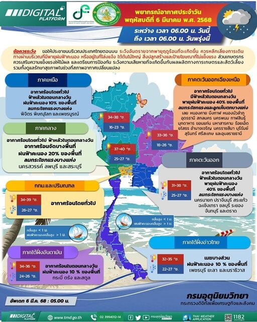 วันที่ 6 มี.ค.2568 กรมอุตุนิยมวิทยา พยากรณ์อากาศ 24 ชั่วโมงข้างหน้า บริเวณภาคตะวันออกเฉียงเหนือ และภาคตะวันออก จะมีพายุฤดูร้อนเกิดขึ้น โดยมีลักษณะพายุฝนฟ้าคะนอง ฟ้าผ่า ลมกระโชกแรง และลูกเห็บตกบางแห่ง ในขณะที่ภาคอื่นๆ จะได้รับผลกระทบในระยะถัดไป