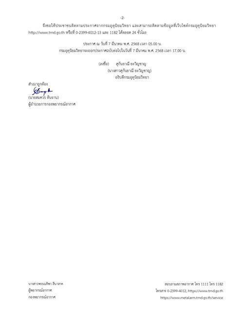 ประกาศ ณ วันที่ 7 มีนาคม พ.ศ. 2568 เวลา 05.00 น. ทั้งนี้ กรมอุตุนิยมวิทยาจะออกประกาศฉบับต่อไปในวันที่ 7 มีนาคม พ.ศ. 2568 เวลา 17.00 น.