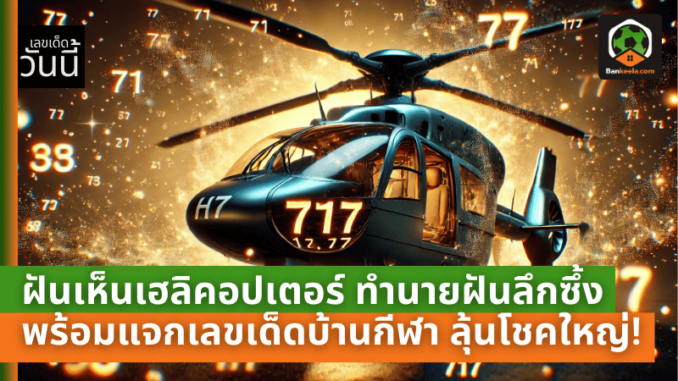 สำหรับการฝันเห็นเฮลิคอปเตอร์ ไม่ว่าจะในลักษณะใดๆ ก็ตาม มักจะเชื่อมโยงกับเรื่องโชคลาภและการเสี่ยงโชคอย่างแน่นอน โดย เลขเด็ดบ้านกีฬา ที่น่าสนใจได้แก่ 17, 71, 117, 171 และ 717 ซึ่งเป็นเลขที่มีโอกาสนำพาโชคดีมาให้ ลองนำไปเสี่ยงโชคดูกัน อาจทำให้คุณได้รับโชคใหญ่ก็เป็นได้!