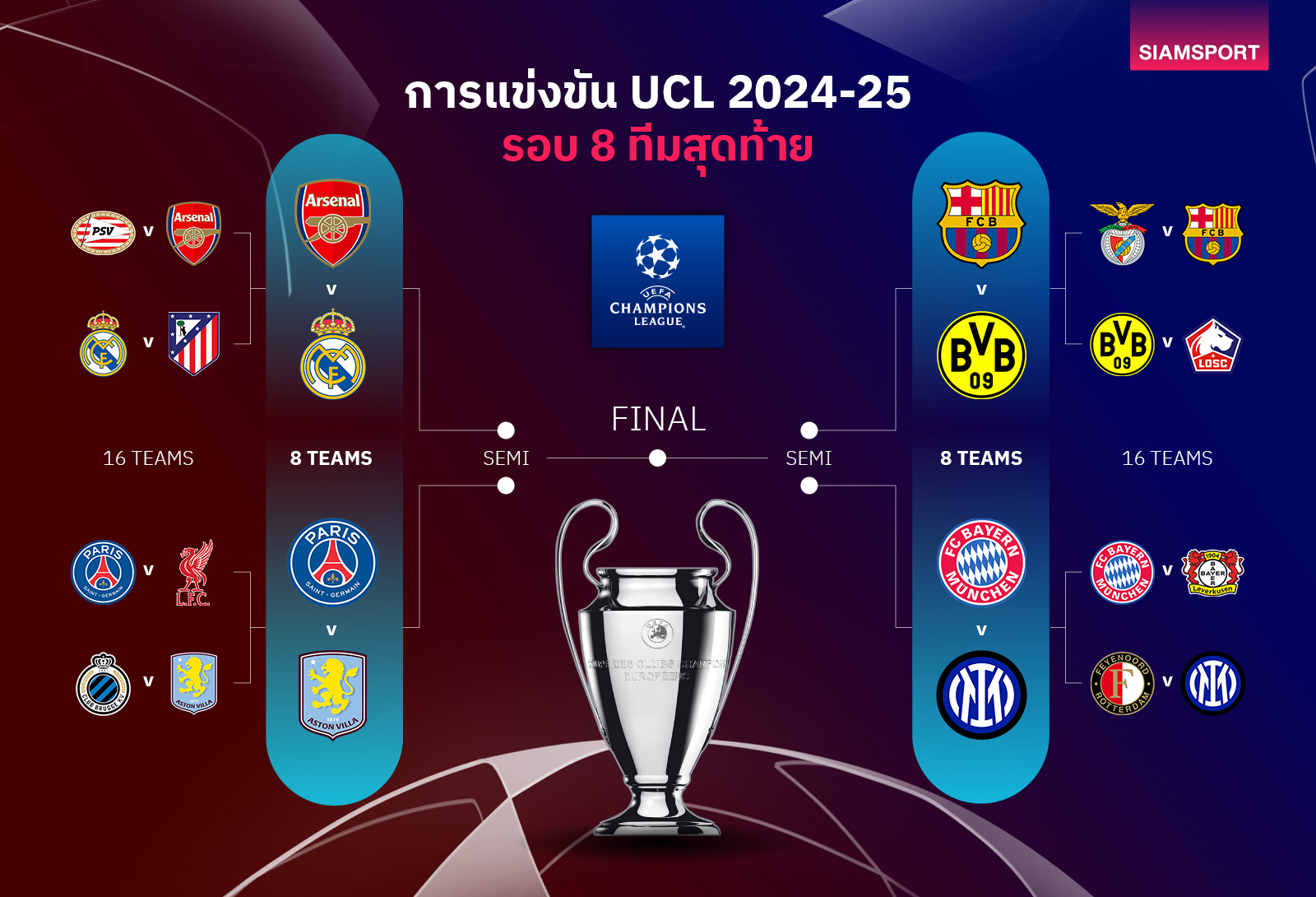 ศึกฟุตบอล ยูฟ่า แชมเปี้ยนส์ ลีก ฤดูกาล 2024/25 ก้าวผ่านรอบ 16 ทีมสุดท้าย เป็นที่เรียบร้อย หลังจากที่ทราบผลการแข่งขันอีกสี่คู่ เมื่อคืนวันพุธที่ 12 มีนาคม ที่ผ่านมา และนี่คือ 8 ทีมที่จะได้ลุยต่อในรอบก่อนรองชนะเลิศ ซึ่งยังอุดมไปด้วยท็อปทีมอย่าง บาร์เซโลน่า, บาเยิร์น มิวนิค รวมถึง เรอัล มาดริด ที่เป็นแชมป์เก่า