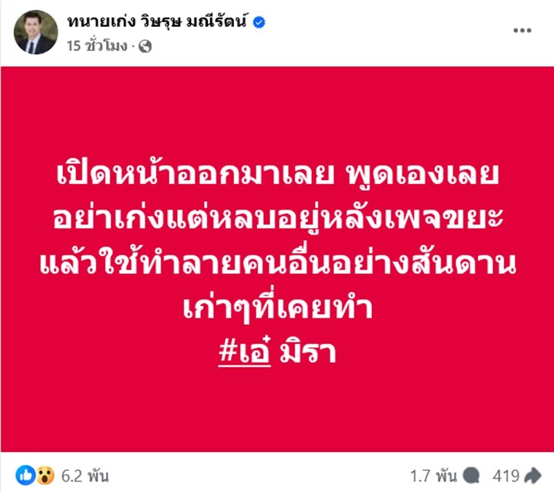 ทนายเก่ง ยังโพสต์ข้อความด้วยว่า “เปิดหน้าออกมาเลย พูดเองเลย อย่าเก่งแต่หลบอยู่หลังเพจขยะ แล้วใช้ทำลายคนอื่นอย่างสันดานเก่าๆที่เคยทำ #เอ๋ มิรา”