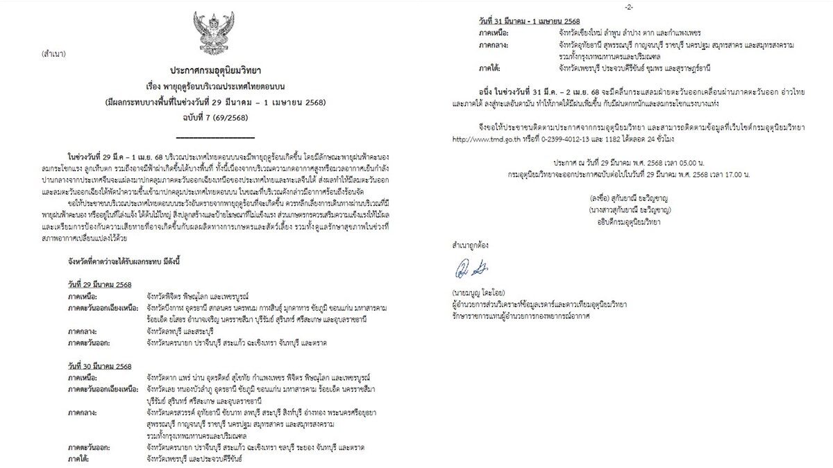 วันที่ 29 มี.ค.2568 กรมอุตุนิยมวิทยา ประกาศกรมอุตุนิยมวิทยา เรื่อง พายุฤดูร้อนบริเวณประเทศไทยตอนบน (มีผลกระทบบางพื้นที่ในช่วงวันที่ 29 มีนาคม – 1 เมษายน 2568) ฉบับที่ 7 (69/2568) ความว่า ช่วงวันที่ 29 มี.ค–1 เม.ย. 68 บริเวณประเทศไทยตอนบนจะมีพายุฤดูร้อนเกิดขึ้น โดยมีลักษณะพายุฝนฟ้าคะนอง ลมกระโชกแรง ลูกเห็บตก รวมถึงอาจมีฟ้าผ่าเกิดขึ้นได้บางพื้นที่