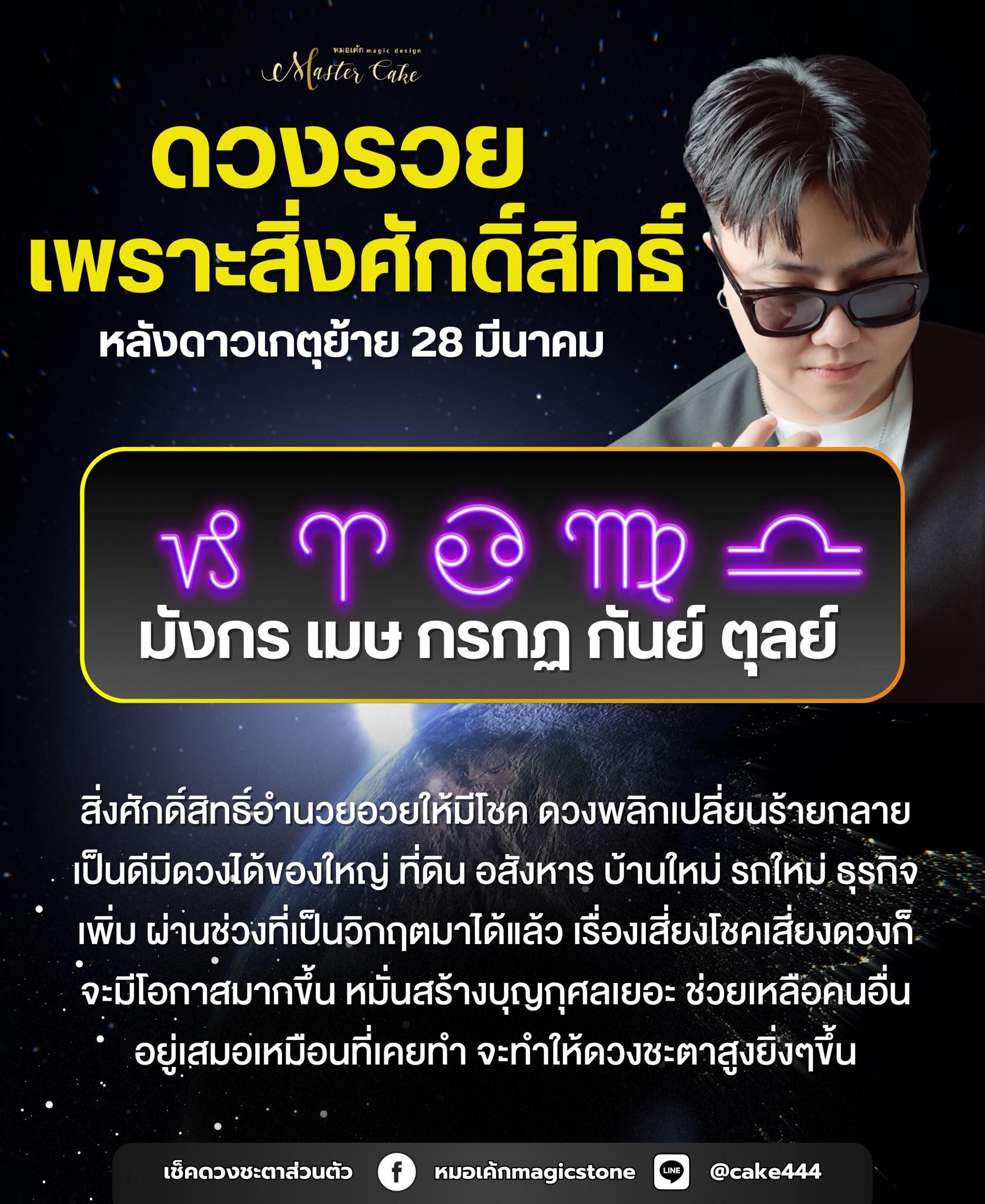 หมอเค้กMagic stone เผยถึงดวงชะตาราศี ดวงรวย เพราะสิ่งศักดิ์สิทธิ์ หลังดาวเกตุย้าย 28 มี.ค.2568 สิ่งศักดิ์สิทธิ์อำนวยอวยให้มีโชค ดวงพลิกเปลี่ยนร้ายกลายเป็นดี มีดวงได้ของใหญ่ ที่ดิน อสังหาริมทรัพย์ บ้านใหม่ รถใหม่ ธุรกิจเพิ่ม ผ่านช่วงที่เป็นวิกฤตมาได้แล้ว เรื่องเสี่ยงโชคเสี่ยงดวงก็มีโอกาสมากขึ้น หมั่นสร้างบุญกุศลเยอะๆ ช่วยเหลือคนอื่นอยู่เสมอเหมือนที่เคยทำ จะทำให้ดวงชะตาสูงยิ่งขึ้น
