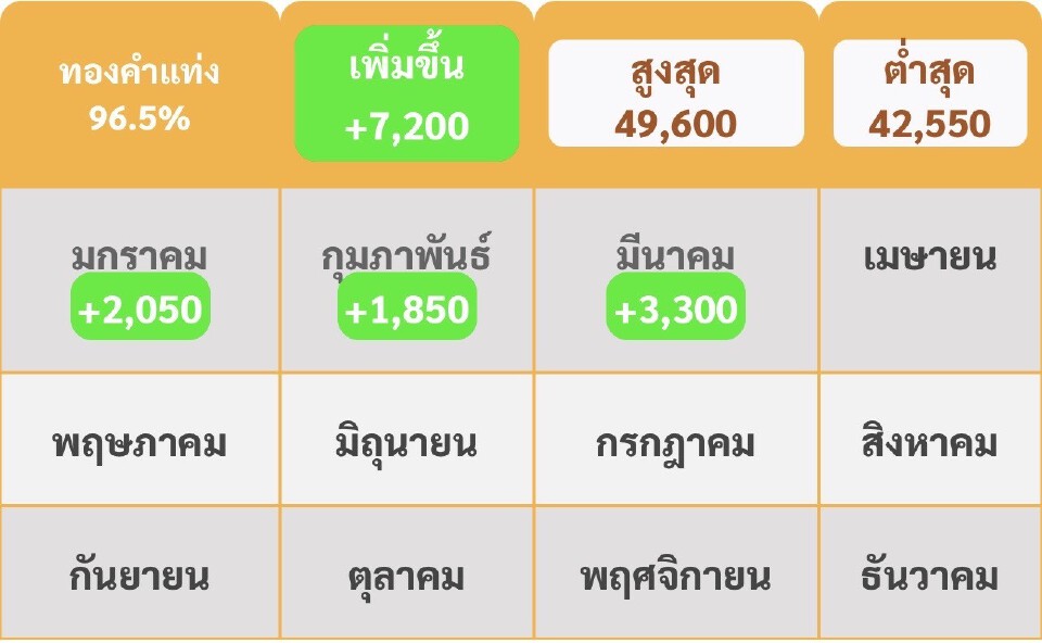 ราคาทองตั้งแต่วันที่ 1 ม.ค.-29 มี.ค. 68 มีการปรับราคาเพิ่มขึ้นแล้วถึง 7,200 บาท