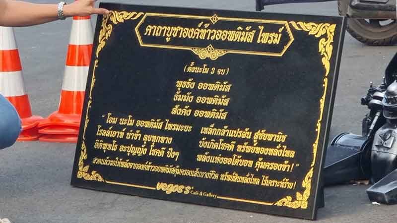 นายนิวัฒน์ เปิดเผยอีกว่า หลังจากนำหุ่นออฟติมัสไพร์มมาตั้งไว้ได้ไม่นานทางพนักงานได้ซื้อพวงมาลัยกับผ้า 3 สีมาผูกไว้ ต่อมาทางร้านเห็นว่ามีลูกค้าให้ความสนใจ จึงไปลองค้นหาคาถาบูชาดู ก็พบว่าในโลกโซเชียลมีคาถาบูชาอยู่ ทางร้านจึงได้สั่งทำคาถาบนแผ่นหินอ่อนมาติดตั้งไว้ เผื่อเอาใจลูกค้าและสายมูที่แวะเวียนมาบูชาหรือถ่ายรูปเล่น โดยทางร้านตั้งใจให้เป็นที่เที่ยวสถานที่มูแห่งใหม่ใน จ.นนทบุรี และก็ไม่น่าเชื่อว่าหลังทางร้านนำมาท้าวออฟติมัสไพร์มมาตั้งได้แค่เพียง 10 กว่าวัน