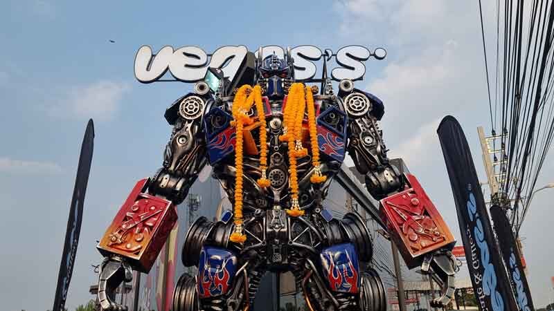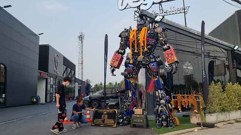 เมื่อเวลา 17.00 น. วันที่ 1 เม.ย.2568 ผู้สื่อข่าวเดินทางไปที่ร้านเวกัส คาเฟ่ ถนนนครอินทร์ ต.บางขนุน อ.บางกรวย จ.นนทบุรี เพื่อสอบถามที่มาที่ไปของหุ่นออฟติมัส ไพร์ม ตัวดังกล่าว โดยพบว่าที่ด้านหน้าของร้านมีหุ่นยนต์ท้าวออฟติมัส ไพร์ม ซึ่งมีขนาดความสูงประมาณ 4 เมตร ถูกคล้องคอด้วยพวงมาลัยดอกไม้สีเหลือง ที่ขาทั้ง 2 ข้างผูกด้วยผ้า 3 สี