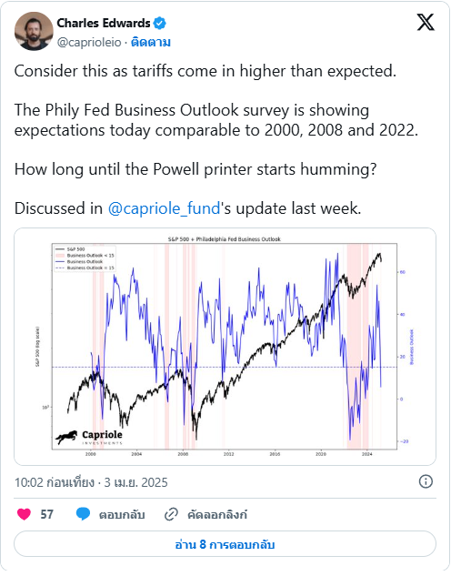 Charles Edwards ผู้ก่อตั้งกองทุน Capriole Investments ชี้ว่าภาษีที่สูงกว่าคาดกำลังสร้างความไม่แน่นอนในตลาดธุรกิจอเมริกา ซึ่ง Bitcoin ได้ตอบสนองในเชิงลบมากกว่าตลาดหุ้นสหรัฐฯ โดย BTC ร่วงลงถึง 8.5% ในวันที่ Trump ประกาศนโยบายภาษีใหม่ ขณะที่ดัชนี S&P 500 ปิดตลาดด้วยการปรับตัวขึ้นเล็กน้อย 0.7%