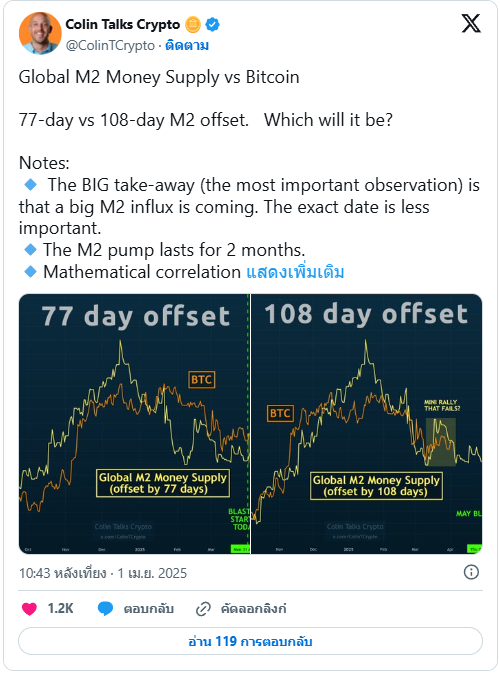 โดย Colin Talks Crypto นักวิเคราะห์สายเทคนิค กล่าวเสริมว่า “สิ่งที่สำคัญที่สุดในตอนนี้คือ ปริมาณ M2 ที่กำลังจะทะลักเข้าสู่ระบบเศรษฐกิจ ซึ่งประวัติศาสตร์แสดงให้เห็นว่ามักส่งผลให้ราคา Bitcoin พุ่งขึ้นในเวลาต่อมา” โดยเขาคาดว่าอาจเห็นการฟื้นตัวของราคาช่วงต้นเดือนพฤษภาคมนี้