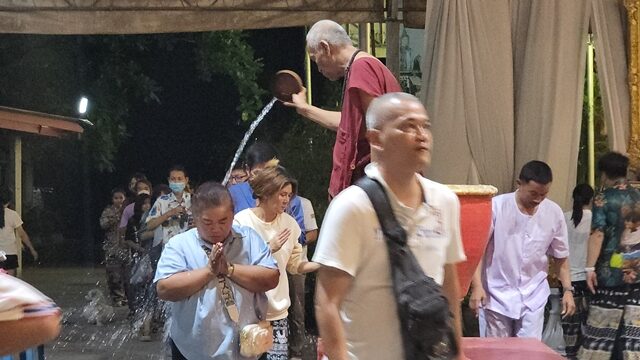 โดยทุกคนต่างเข้าแถวเป็นแถวยาวหลวงพ่อแป๊ะยืนบนแท่น รดน้ำมนต์ให้คนละขัน จนครบทุกคน ท่ามกลางเสียงสวดมต์ชินบัญชร ตลอดเวลาขณะที่หลวงพ่ออาบน้ำมนต์ให้สาธุชน
