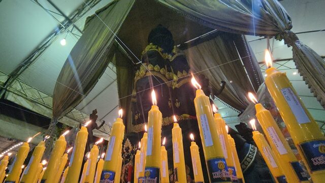 พิธีจัดขึ้นที่บริเวณทางขึ้นศาลาการเปรียญ ข้างพระตรีมูรติปางก้าวหน้า ที่ใหญ่ที่สุดในประเทศไทย โดยบริเวณด้านหน้าสิ่งศักดิ์สิทธิ์ จะมีต้นเทียนจำนวนมากของสาธุชนที่เข้าร่วมพิธีนำมาร่วมบูชาสักการะบูชา เพื่อให้หลวงพ่อแป๊ะประกอบพิธีจุดเป็นการเสริมดวง เสริมโชคลาภ