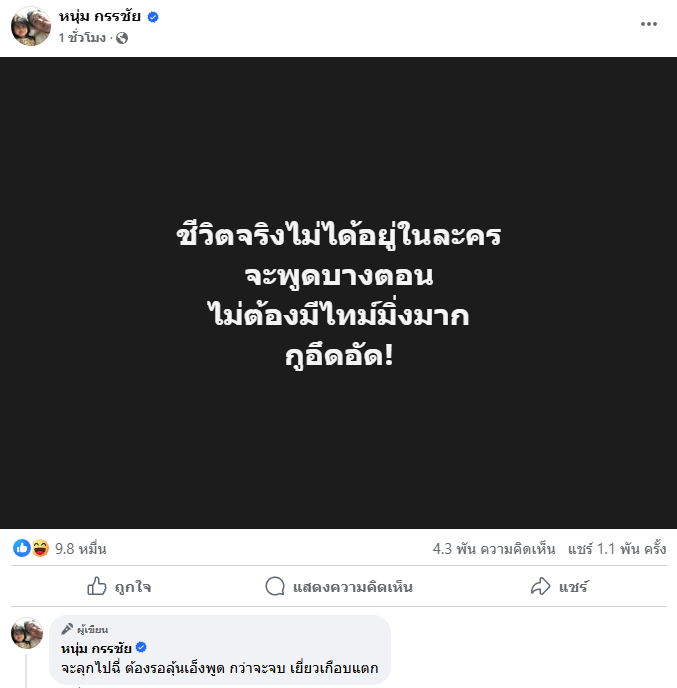 โดย หนุ่ม กรรชัย โพสต์ข้อความสั้นๆ ระบุว่า “ชีวิตจริงไม่ได้อยู่ในละคร จะพูดบางตอน ไม่ต้องมีไทม์มิ่งมาก กูอึดอัด!” นอกจากนี้ หนุ่ม กรรชัย ยังคอมเมนต์ต่อในโพสต์ดังกล่าวว่า “จะลุกไปฉี่ ต้องรอลุ้นเอ็งพูด กว่าจะจบ เยี่ยวเกือบแตก”