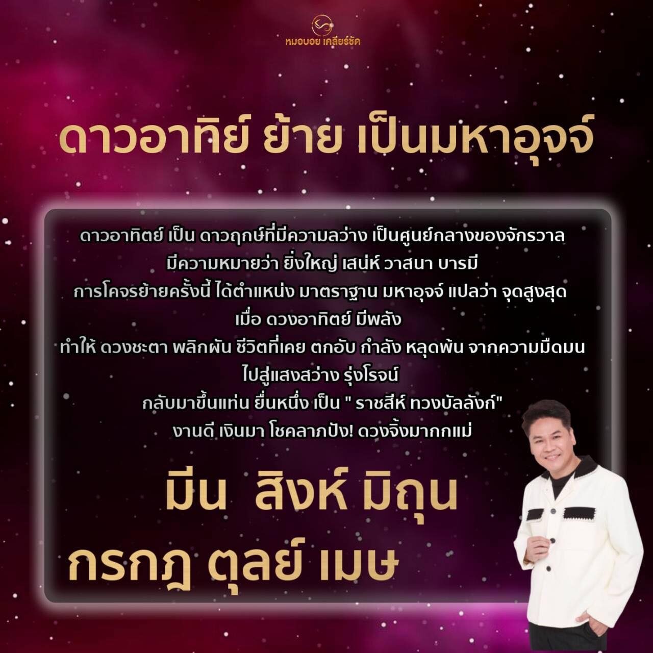 หมอบอย เคลียร์ชัด เผยดวงชะตาราศี ดาวอาทิตย์ย้าย เป็นมหาอุจจ์ ดาวาทิตย์เป็นดาวฤกษ์ที่มีความสว่าง เป็นศูนย์กลางจักรวาล มีความหมายว่ายิ่งใหญ่ เสน่ห์ วาสนา บารมี การโคจรย้ายครั้งนี้ ได้ตำแหน่ง มาตรฐาน มหาอุจจ์ แปลว่า จุดสูงสุด เมื่อดวงอาทิตย์มีพลัง ทำให้ดวงชะตาพลิกผัน ชีวิตที่เคยตกอับ กำลังหลุดพ้นจากความมืดมน ไปสู่แสงสว่างรุ่งโรจน์ กลับมาขึ้นแท่นยืนหนึ่ง เป็นราชสีห์ ทวงบัลลังก์ งานดีเงินมา โชคลาภปัง ดวงจิ้งมาก