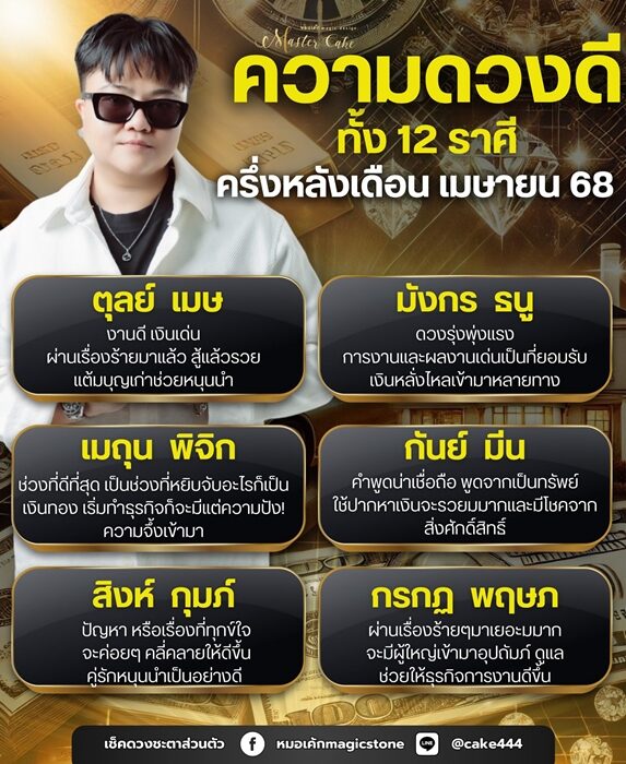 หมอเค้ก Magic stone เปิดความดวงดีทั้ง 12 ราศี ครึ่งหลังเดือนเมษายน 2568 ราศีใดงานดี เงินเด่น ราศีใดเงินหลั่งไหลเข้ามาหลายทาง ดวงรุ่งพุ่งแรง