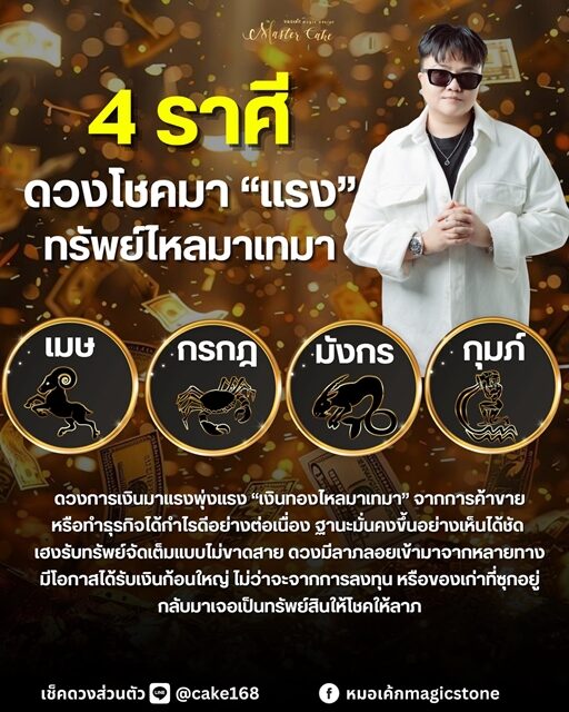 หมอเค้ก Magic stone เปิดชะตา 4 ราศี ดวงโชคมาแรง ทรัพย์ไหลมาเทมา ดวงมีลาภลอยเข้ามา มีโอกาสได้รับเงินก้อนใหญ่ ประกอบด้วย ราศีเมษ ราศีกรกฎ ราศีมังกร และ ราศีกุมภ์ โดยมีรายละเอียดดังนี้