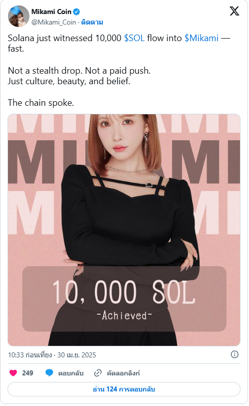ล่าสุด (30 เม.ย.) บัญชี X อย่างเป็นทางการของเหรียญ $Mikami ซึ่งเป็นเหรียญมีมที่สร้างขึ้นโดยอดีตดารา AV ชื่อดัง Yua Mikami ได้ออกมาเปิดเผยว่า หลังจากเปิดให้ซื้อขายได้เพียงไม่กี่ชั่วโมง ก็มีกระแสตอบรับถล่มทลาย มีผู้คนแห่เข้ามาซื้อเหรียญกันอย่างล้นหลาม จนมียอดขายรวมทะลุ 10,000 SOL หรือคิดเป็นมูลค่าราว 50 ล้านบาทเลยทีเดียว