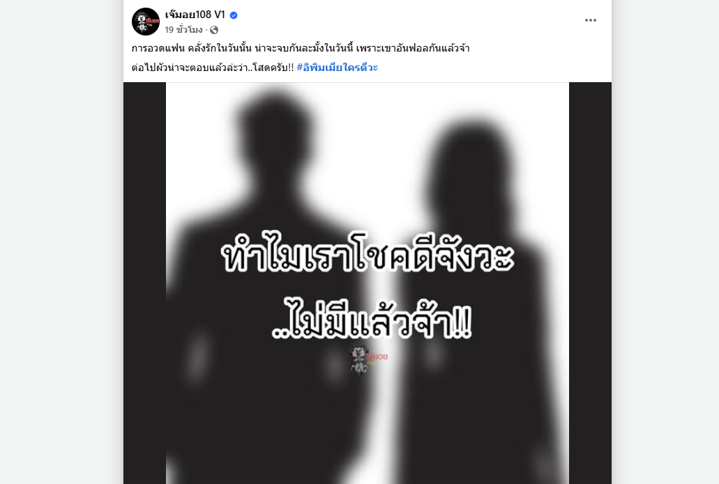 เพจ เจ๊มอย108 V1 โพสต์ภาพเงาผู้หญิงผู้ชาย เขียนข้อความในภาพว่า “ทำไมเราโชคดีจังวะ ..ไม่มีแล้วจ้า” พร้อมทั้งเขียนแคปชั่นบรรยายภาพว่า “การอวดแฟน คลั่งรักในวันนั้น น่าจะจบกันละมั้งในวันนี้ เพราะเขาอันฟอลกันแล้วจ้า ต่อไปผัวน่าจะตอบแล้วล่ะว่า..โสดครับ!! #อิพิมเมียใครดีวะ”