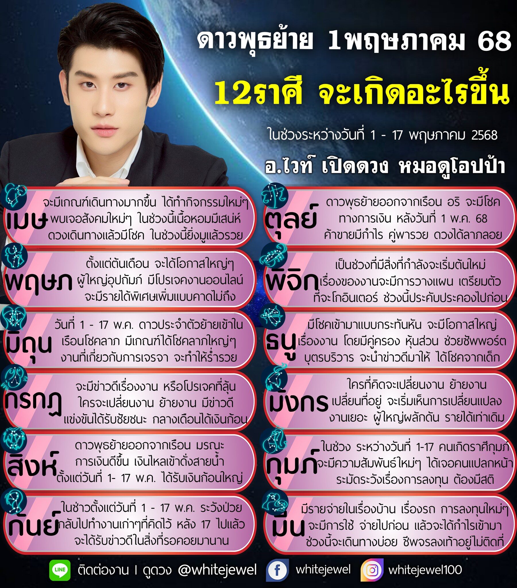 อ.ไวท์ เปิดดวง 12 ราศี ดาวพุธย้าย มีเกณฑ์ได้งานใหม่ โชคลาภจัดเต็ม เงินไหลเข้าดั่งสายน้ำ