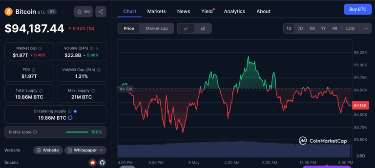 ในขณะที่รายงาน ราคา Bitcoin กำลังซื้อขายอยู่ที่ 94,187 ดอลลาร์ ลดลง 0.45% ภายใน 24 ชั่วโมง อ้างอิงข้อมูลจาก coinmarketcap