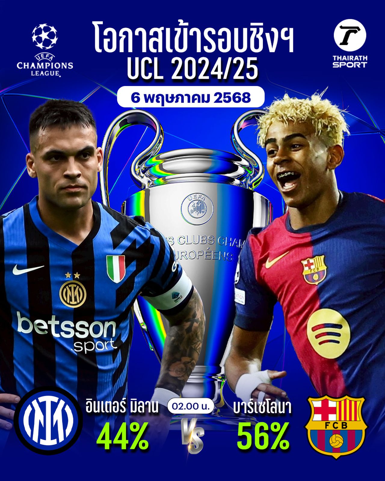 02.00 น. อินเตอร์ มิลาน (44%) VS บาร์เซโลนา (56%)