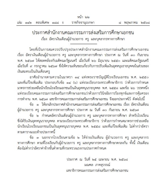 ที่มา : ราชกิจจาฯ ปรับเงินเดือนครูเอกชน ทุกระดับวุฒิการศึกษา เผยอัตราล่าสุด - ข่าวสด
