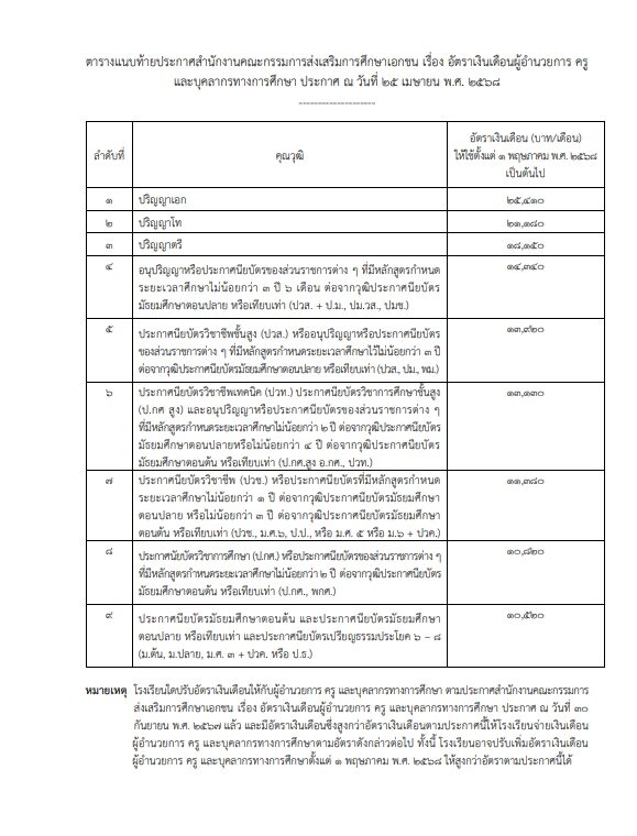 ข้อ 2 กำหนดอัตราเงินเดือนผู้อำนวยการ ครู และบุคลารทางการศึกษา สำหรับเรียน ซึ่งได้รับเงินอุดหนุนรายบุคคล ตามระเบียบกระทรวงศึกษาธิการ ว่าด้วยการกำหนดมาตรการช่วยเหลือ นักเรียนโรงเรียนเอกชนเป็นเงินอุดหนุนรายบุคคล พ.ศ. 2558 และที่แก้ไขเพิ่มเติม ไม่ต่ำกว่าอัตรา ตามตารางแนบท้ายประกาศนี้