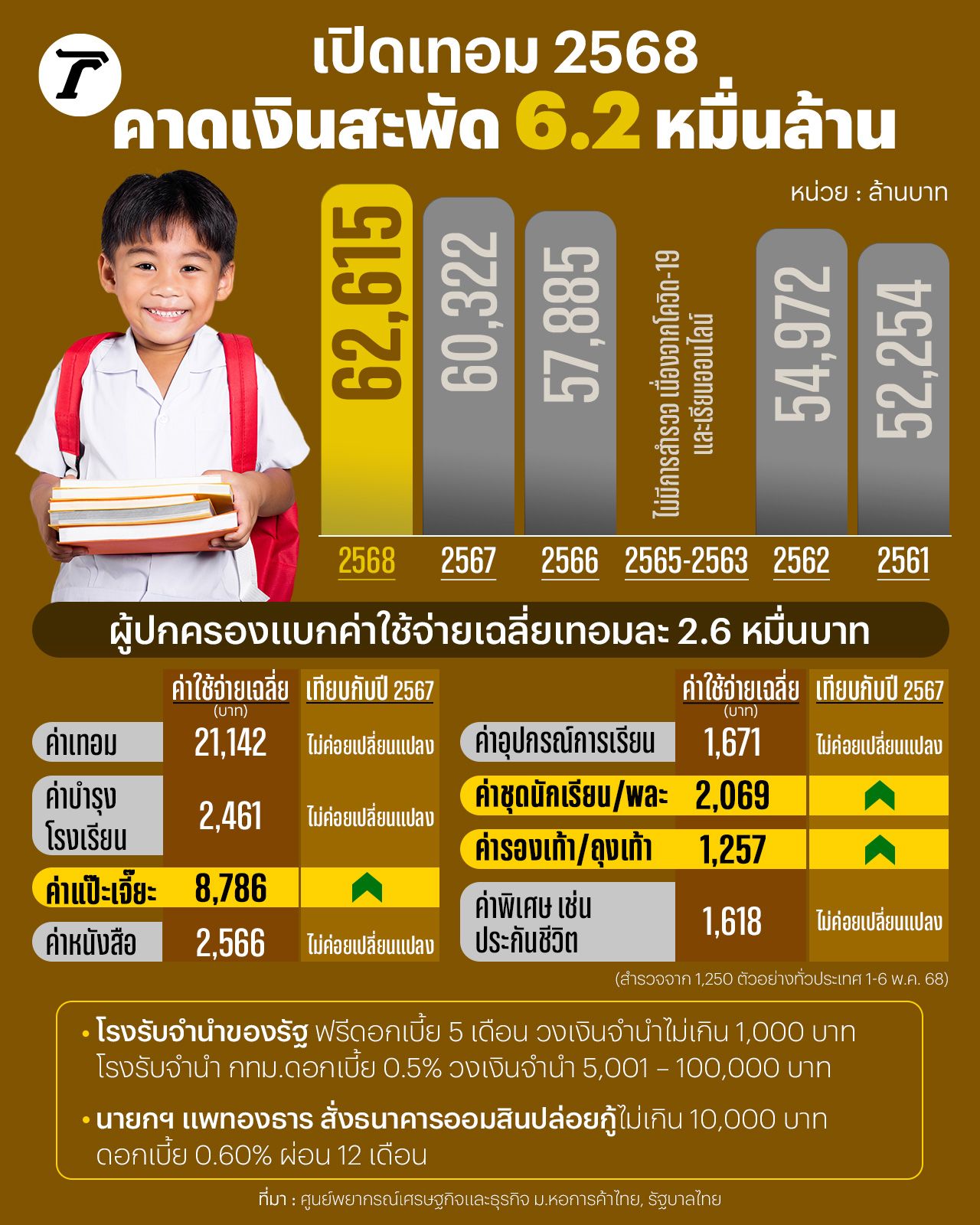 ที่มา : เปิดเทอม 2568 คาดเงินสะพัด 6.2 หมื่นล้าน ผู้ปกครองแบกค่าใช้จ่าย 2.6 หมื่นบาทต่อคน