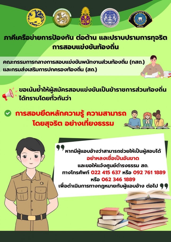 หากพบเห็นผู้แอบอ้างว่าสามารถช่วยให้เป็นผู้สอบได้ อย่าหลงเชื่อ ขอให้แจ้งศูนย์ดำรงธรรม สถ. โทร. 022-415637 หรือ 092-7611889 หรือ 062-3461889