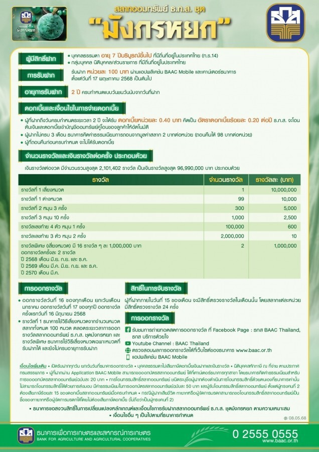 ที่มา : เช็กเงื่อนไข สลากออมทรัพย์ ธ.ก.ส. ชุด "มังกรหยก" เริ่มต้น 100 บาท