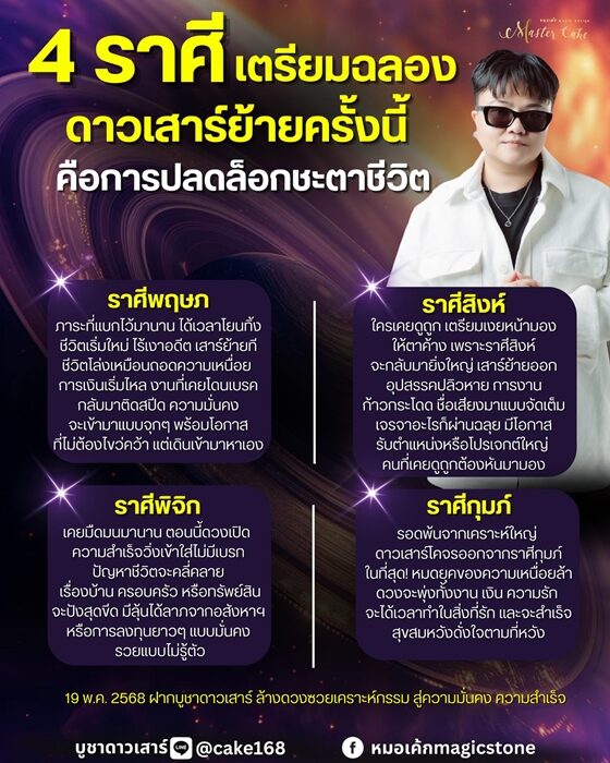 หมอเค้ก Magic stone เปิดราศี เตรียมฉลองดาวเสาร์ย้ายครั้งนี้ ปลดล็อกชะตาชีวิต การงานก้าวกระโดด รอดพ้นจากเคราะห์ใหญ่ ดวงจะพุ่งทั้งงาน เงิน ความรัก