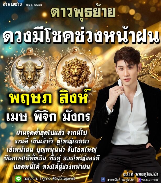 อ.ไวท์ เปิดชะตาราศี ดาวพุธย้าย ดวงมีโชคช่วงหน้าฝน ผ่านจุดต่ำสุดไปแล้ว จากนี้ไป งานดี เงินเข้ารัว ผู้ใหญ่เมตตา บุญหนุนนำ รับโชคใหญ่
