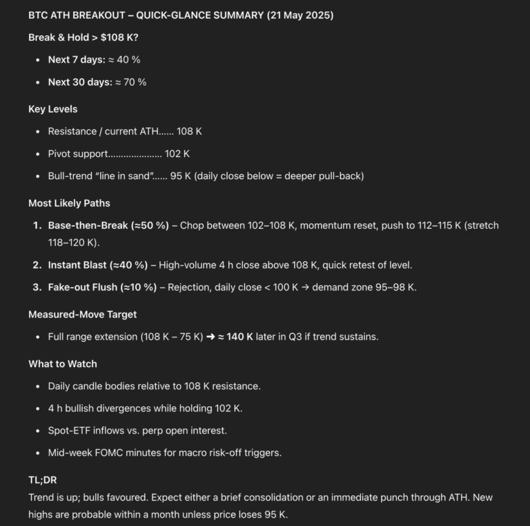 จากการประเมินของ ChatGPT โอกาสที่ราคา Bitcoin จะทะลุและยืนเหนือ 108,000 ดอลลาร์ ได้ในสัปดาห์หน้าอยู่ที่ประมาณ 40% และที่น่าตื่นเต้นกว่านั้นคือโอกาสจะเพิ่มขึ้นเป็นประมาณ 70% ภายใน 30 วันข้างหน้า