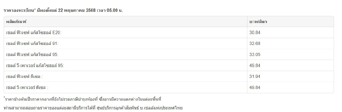 ราคาน้ำมันใหม่เชลล์ แวะปั๊มน้ำมัน จอดรถเติมน้ำมันเต็มลิตร น้ำมันทรงตัว น้ำมันลงเท่าไร? เช็กราคาน้ำมันวันนี้ 2568 ประจำวันที่ 22 พ.ค. 68 ตารางราคาน้ำมันเชลล์ เปิดขายลิตรกี่บาท