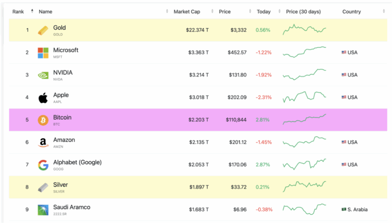 ในวันที่ 22 พฤษภาคม 2025 ราคา Bitcoin ได้พุ่งทะลุเหนือแนวต้านทางจิตวิทยาที่ $110,000 ได้สำเร็จ ส่งผลให้มูลค่าตลาดรวม (Market Cap) ของ Bitcoin พุ่งแตะ 2.2 ล้านล้านดอลลาร์สหรัฐ แซงหน้าสินทรัพย์ระดับโลกอย่าง Amazon , Google และแม้แต่ Silver ขึ้นมาอยู่ในลำดับที่ 5 รองจากเพียงทองคำ, Apple, Microsoft และ NVIDIA เท่านั้น