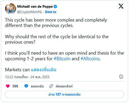 ล่าสุดนักวิเคราะห์ชื่อดัง Michael van de Poppe ก็ได้ออกมาแสดงความคิดเห็นว่า วัฏจักรตลาดรอบนี้ อาจไม่ได้จบแค่ 4 ปีเหมือนที่ผ่านๆมา แต่อาจลากยาวไปจนถึงปี 2026 หรือ 2027 แถมยังแรงกว่าทุกครั้งที่ผ่านมา พร้อมคาดการณ์ว่า ราคา Bitcoin อาจพุ่งไปได้ไกลถึง 400,000 ดอลลาร์ ถึง 600,000 ดอลลาร์ ภายในปี 2026 และ 2027 เลยทีเดียว