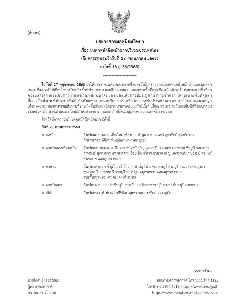 นางสาวสุกันยาณี ยะวิญชาญ อธิบดีกรมอุตุนิยมวิทยา ออกประกาศกรมอุตุนิยมวิทยา ฉบับที่ 13 (133/2568) เรื่อง ฝนตกหนักถึงหนักมากบริเวณประเทศไทย มีผลกระทบจนถึงวันที่ 27 พฤษภาคม 2568