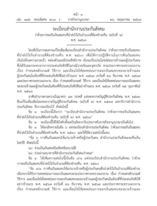 เว็บไซต์ ราชกิจจานุเบกษา ได้เผยแพร่ ระเบียบสำนักงานประกันสังคม ว่าด้วยการขอรับเงินสมทบที่นำส่งไว้เกินจำนวนที่ต้องชำระคืน ฉบับที่ 2 พ.ศ.2568 ลงนามโดย นางมารศรี ใจรังษี เลขาธิการสำนักงานประกันสังคม โดยสาระสำคัญของระเบียบฉบับดังกล่าวจะสอดรับกับการคืนเงินที่สำนักงานประกันสังคมต้องดำเนินการคืนเงินให้กับผู้ประกันตน โดยวิธีดังต่อไปนี้