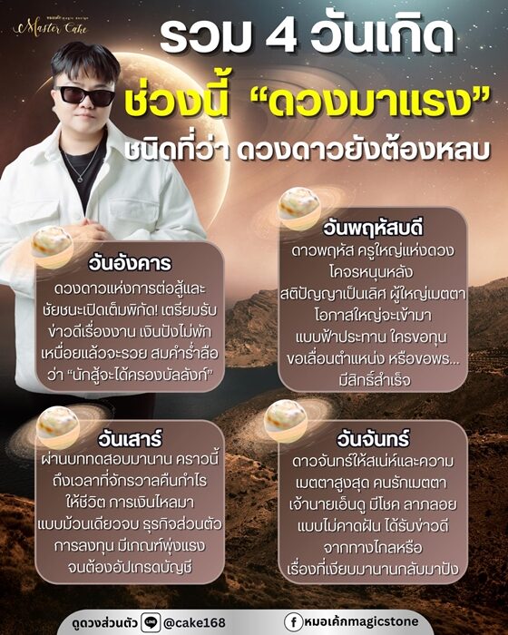 หมอเค้ก Magic stone เปิดชะตา 4 วันเกิด ช่วงนี้ “ดวงมาแรง” เตรียมรับข่าวดีเรื่องงาน มีโชคลาภลอยแบบไม่คาดฝัน การเงินไหลมาแบบม้วนเดียวจบ