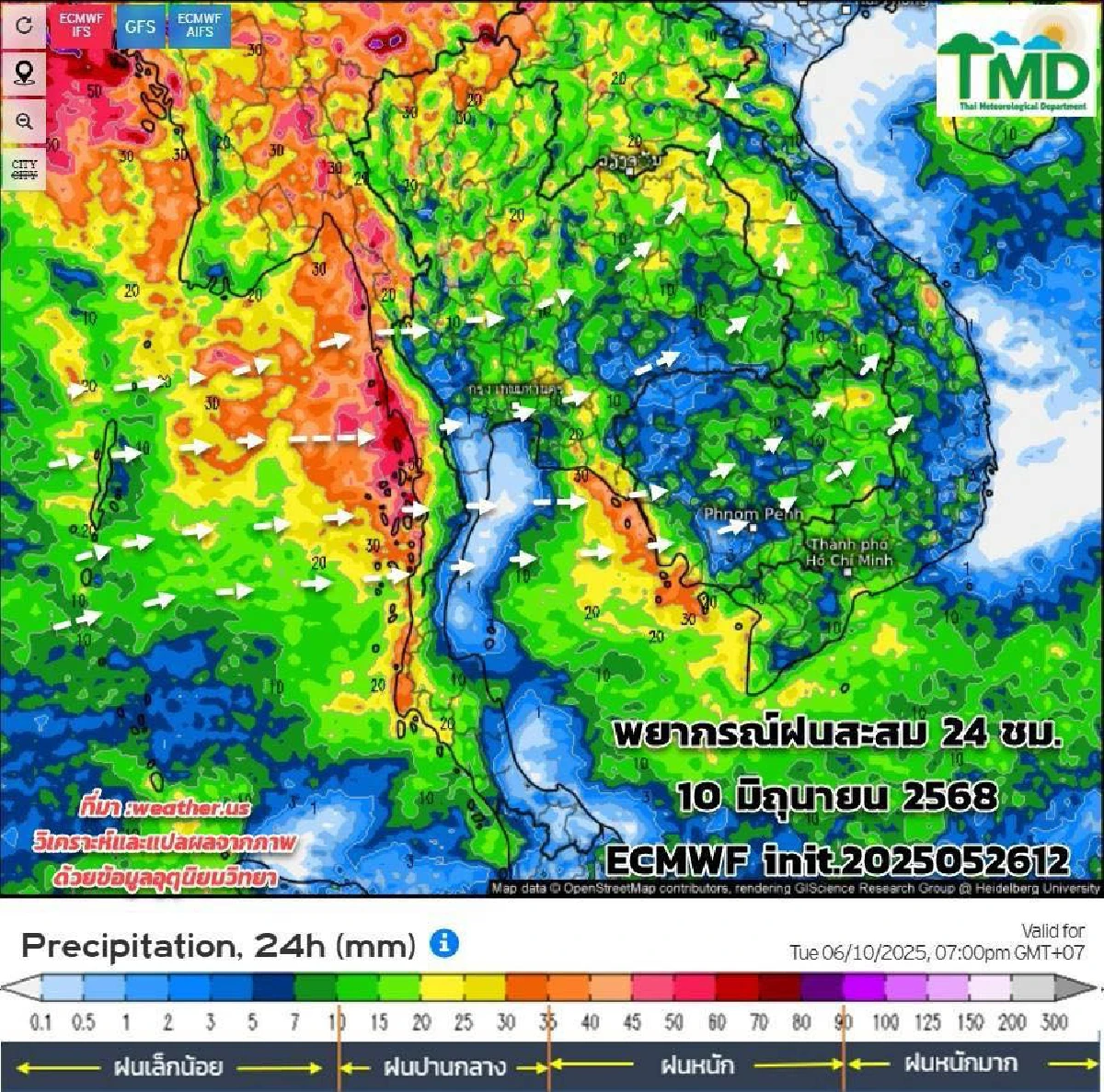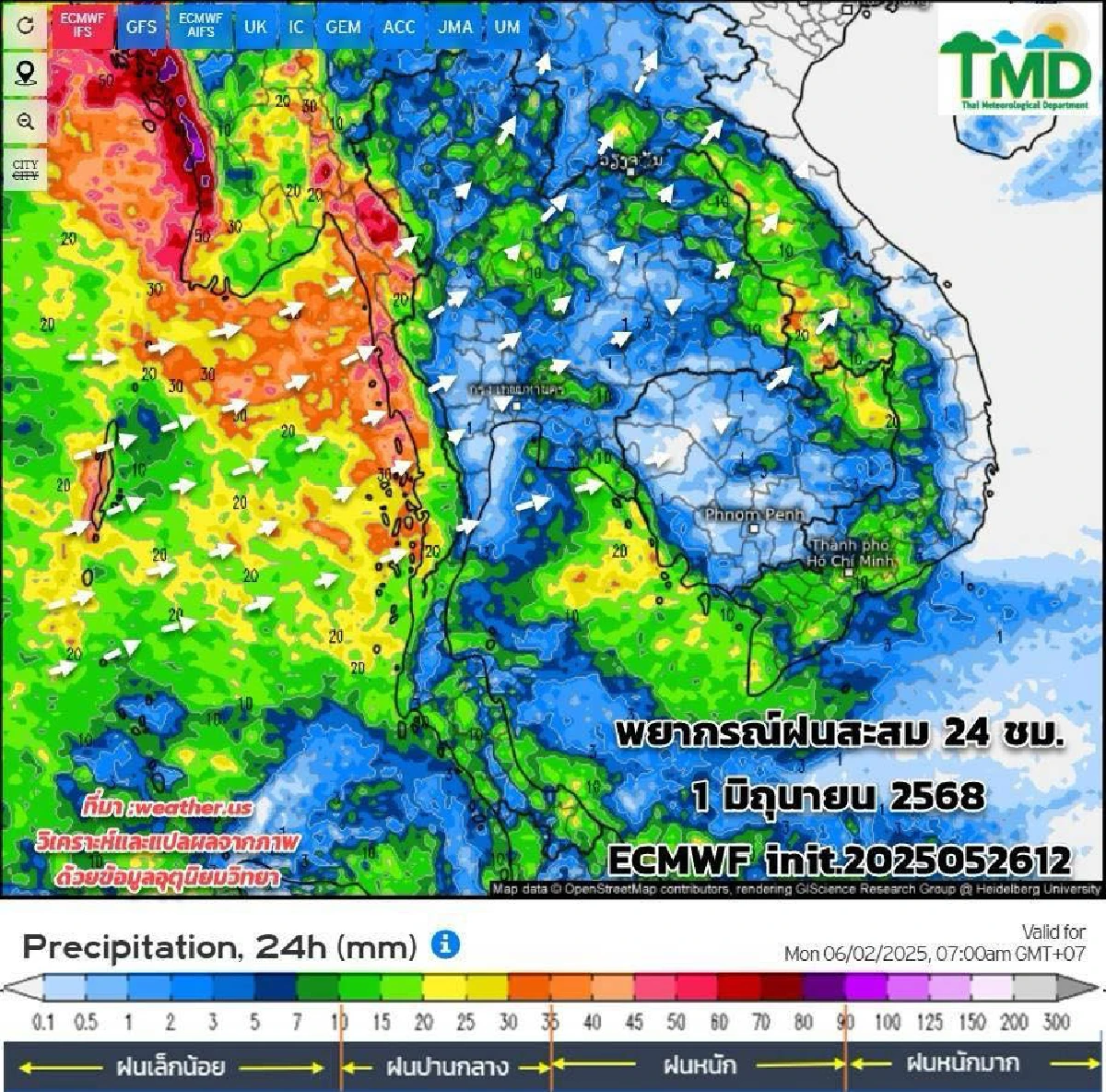 อัปเดตผลการพยากรณ์ฝนสะสมรายวัน ทุกๆ 24 ชม. นับตั้งแต่ 07.00น. ถึง 07.00น.วันรุ่งขึ้น และลมที่ระดับ 925hPa (750 ม.)15 วันล่วงหน้า ระหว่าง 27 พ.ค.- 10 มิ.ย.68 init. 2025052612 จากศูนย์พยากรณ์อากาศระยะกลางยุโรป (ECMWF) วิเคราะห์ตามผลจากแบบจำลองฯ เฉดสีแดงหมายถึงฝนหนัก สีเขียวหมายถึงฝนเล็กน้อย
