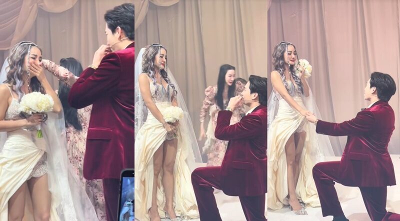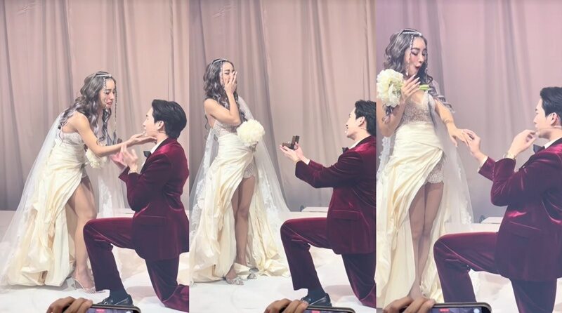 กระแต ถึงกับปล่อยโฮแล้ว โดย โตชิ คุกเข่ากล่าวความในใจขอแต่งงานอย่างสุดซึ้งว่า “ขอขอบคุณทุกสิ่งทุกอย่างที่ทำให้ผมได้เจอกับที่รักครับ ผมอยากให้ที่รักเป็นดาวที่คอยส่องแสงชีวิตผมไปตลอดกาล ผมสัญญาจะขออยู่เคียงข้างที่รักแม้ในยามสุขหรือยามทุกข์ ผมอยากใช้ชีวิตที่เหลืออยู่ทั้งชีวิตอยู่กับที่รักครับ”