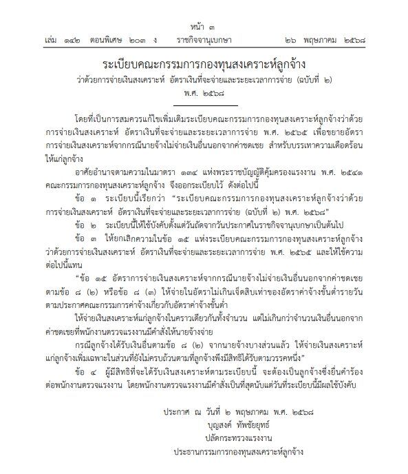 ราชกิจจาฯ ประกาศแล้ว เพิ่มเงินสงเคราะห์ลูกจ้าง จาก 60 เท่าของอัตราค่าจ้างขั้นต่ำรายวัน เป็น 70 เท่า มีผลบังคับใช้ตั้งแต่วันนี้เป็นต้นไป