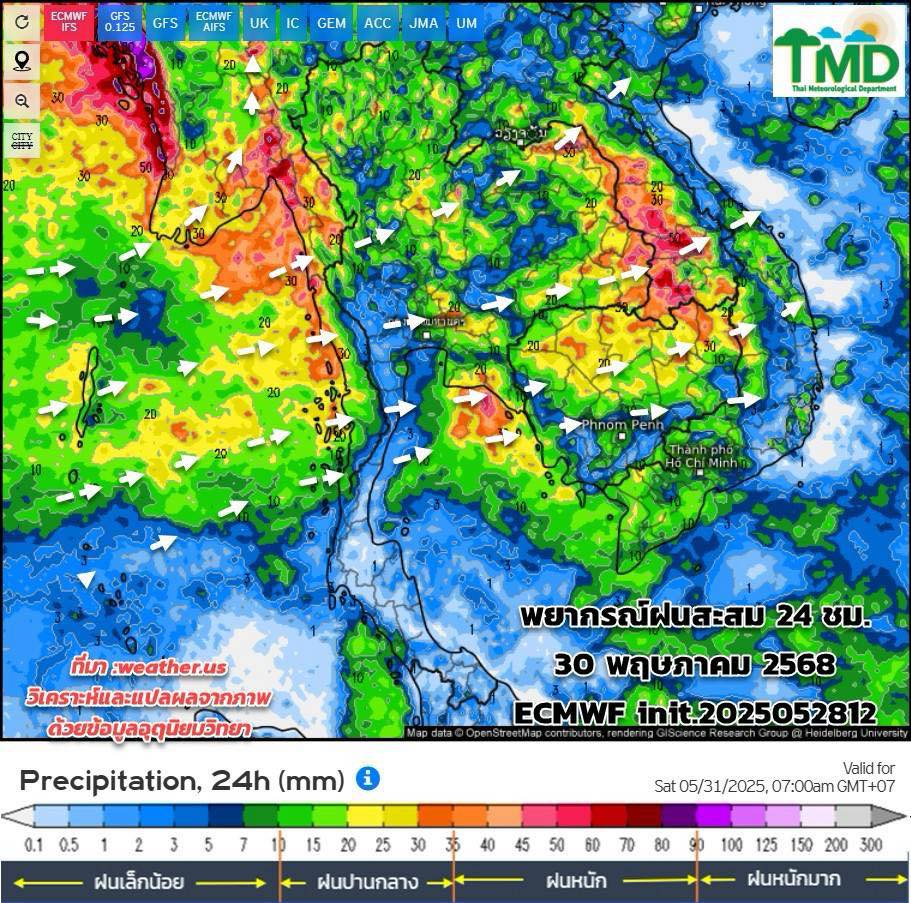 วันที่ 29 – 31 พ.ค.68 บริเวณพื้นที่ภาคเหนือ ภาคอีสานตอนบนและด้านตะวันออก ภาคกลางด้านตะวันตก ภาคตะวันออก (จ.ระยอง จันทบุรี ตราด) และภาคใต้ฝั่งอันดามัน (ระนอง พังงา ) ยังต้องเฝ้าระวังฝนที่ตกสะสมไปอีก 1-2 วัน เนื่องจากยังคงมีฝนตกต่อเนื่อง และมีฝนตกหนักบางแห่ง เนื่องจากมรสุมมีกำลังปานกลางถึงค่อนข้างแรง ประกอบมีหย่อมความกดอากาศต่ำกำลังแรงปกคลุมทะเลอันดามันตอนบน มีแนวโน้มจะแรงขึ้นและเคลื่อนตัวไปทางเหนือเข้าสู่ประเทศบังคลาเทศ ไม่มีผลกระทบโดยตรงกับประเทศไทย