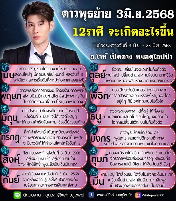 อ.ไวท์ หมอดูโอปป้า เผย ดาวพุธย้าย 3 มิ.ย.2568 เปิดดวงชะตา 12 ราศี จะเกิดอะไรขึ้น ในช่วงระหว่างวันที่ 3 มิ.ย.-23 มิ.ย.2568 เช็กเลย ราศีใดได้โอกาสเริ่มต้นสิ่งใหม่ ๆ ราศีใดมีโชคใหญ่แบบไม่ตั้งใจ โดยมีรายละเอียดของแต่ละราศีดังนี้