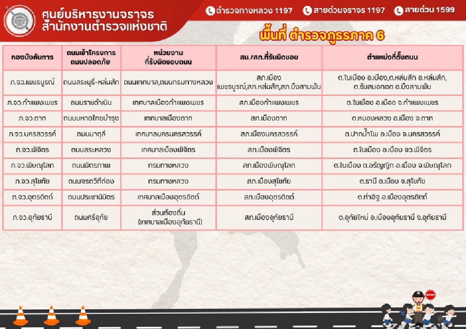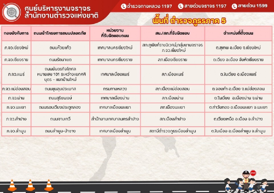 หากประชาชนผู้ใช้รถใช้ถนนพบเหตุต้องสงสัย หรือสอบถามข้อมูลเส้นทางเพิ่มเติม แจ้งอุบัติเหตุจราจร และขอความช่วยเหลือด้านการจราจร สามารถติดต่อได้ที่สายด่วนกองบังคับการตำรวจจราจร 1197 และสายด่วนตำรวจทางหลวง 1193 ได้ตลอด 24 ชั่วโมง