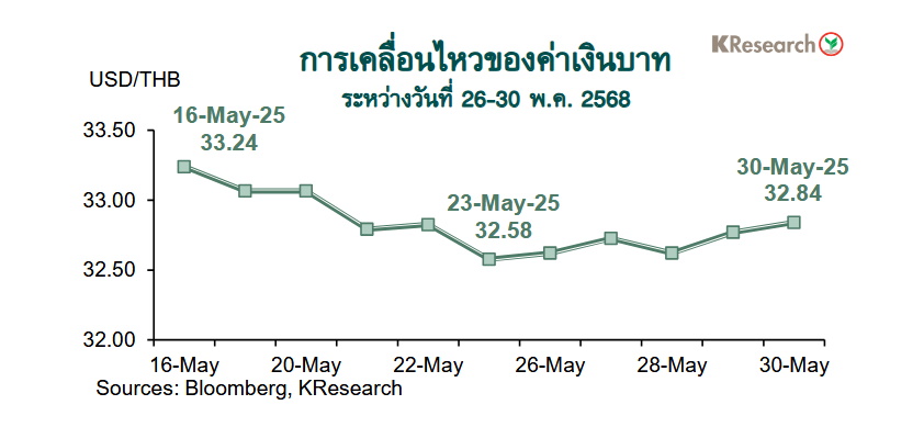 ในวันศุกร์ที่ 30 พ.ค. 2568 เงินบาทปิดตลาดในประเทศที่ 32.84 บาทต่อดอลลาร์ฯ เทียบกับระดับ 32.58 บาทต่อดอลลาร์ฯ ในวันศุกร์ก่อนหน้า (23 พ.ค.) สำหรับสถานะพอร์ตการลงทุนของนักลงทุนต่างชาติระหว่างวันที่ 26-30 พ.ค. 2568 นั้น นักลงทุนต่างชาติขายสุทธิหุ้นไทย 15,588 ล้านบาท และมีสถานะอยู่ในฝั่ง Net Outflows ออกจากตลาดพันธบัตรไทย 12,429 ล้านบาท (ขายสุทธิพันธบัตร 11,821 ล้านบาท และตราสารหนี้หมดอายุ 608 ล้านบาท)