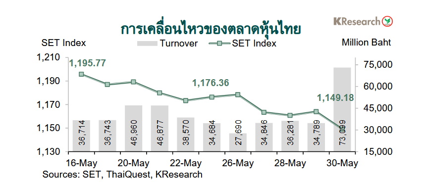 ในวันศุกร์ที่ 30 พ.ค. 2568 ดัชนี SET ปิดที่ระดับ 1,149.18 จุด ลดลง 2.31% จากระดับปลายสัปดาห์ก่อน ขณะที่มูลค่าการซื้อขายเฉลี่ยต่อวันอยู่ที่ 41,340.91 ล้านบาท เพิ่มขึ้น 1.41% จากสัปดาห์ก่อน ส่วนดัชนี mai ลดลง 1.96% มาปิดที่ระดับ 240.46 จุด