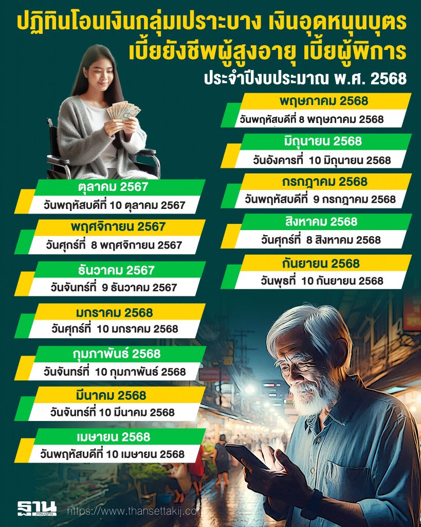 ทั้งนี้สามารถตรวจสอบปฏิทินการรับเงินช่วยเหลือเยียวยากลุ่มเปราะบาง ปีงบประมาณ 2568 ได้ดังต่อไปนี้